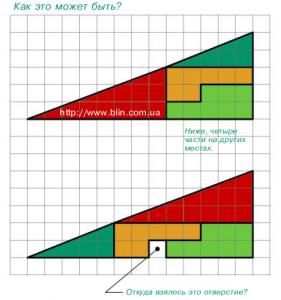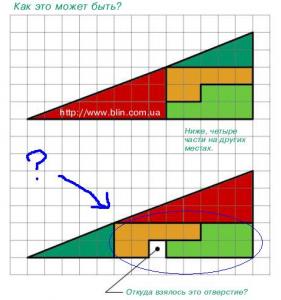 Выделенный участот - прямоугольный. Он состоит из двух фигур разных цветов. Их площадь равна S = 3*5 = 15. Теперь посмотрим на нижний прямоугольник. Он состоит из тех же разноцветных фигур, но у него уже площадь S = 2*8 = 16! А до этого было 15... (IMG:style_emoticons/default/be.gif) Изначально вопрос звучал так: "Как это может быть?". Ответ: "Такое может быть, потому, что 16 - 1 = 15, а на нижней картинке как раз и одного квадратика нет". Другой вопрос, почему так происходит в чем истинная причина парадокса. (IMG:style_emoticons/default/smile.gif) Но это вопрос поинтересней, наверное... Мне интересно, почему все утверждают, что видят не треугольники? По принципу "Не верь глазам своим?" (IMG:style_emoticons/default/smile.gif) Сообщение отредактировал korson - 26.11.2009, 19:24 |