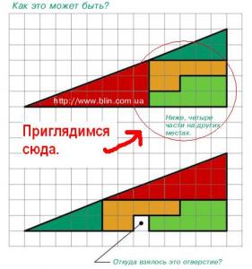 Мне интересно, почему все утверждают, что видят не треугольники? По принципу "Не верь глазам своим?" (IMG:style_emoticons/default/smile.gif) Обе эти фигуре - не треугольники. Проверяется это элементарно: "гипотенуза", исходя из координат её концов, выражается функцией y=5x/13+5, но вершины рассмотренных вами прямоугольников, имеющие координаты (-5, 3) и (-8, 2) на ней не лежат, а отклоняются от неё на 1/13 в разные стороны. -------------------- I want be cruel, want be sad,